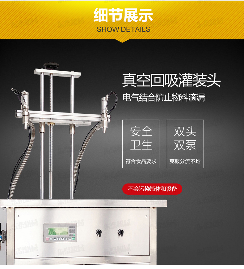 5.電氣結合---灌裝頭帶有回吸功能,防止物料滴漏,保證了瓶身與設備的潔凈