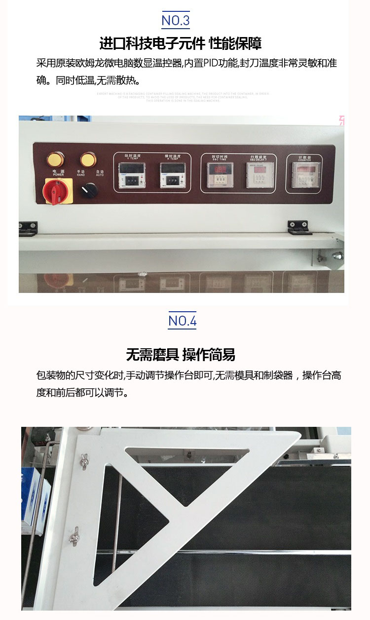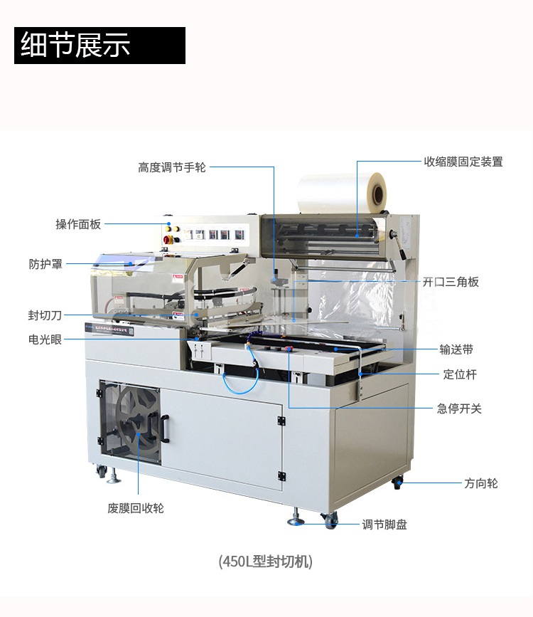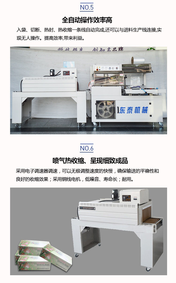 全自動套膜收縮機是由全自動450L封切機和熱收縮機組成,入袋、切斷、熱封、熱收縮一條線自動完成,還可以與進料生產線連接,實現無人操作。提高效率,帶來利益。全自動化封切收割,適用于各種物品的套膜及收縮,生產效率高,品質有保證。