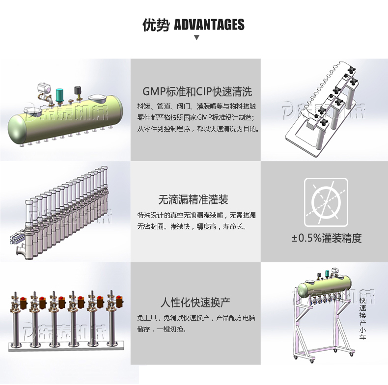 F、灌裝閥由氣動閥控制,灌裝精度更高。