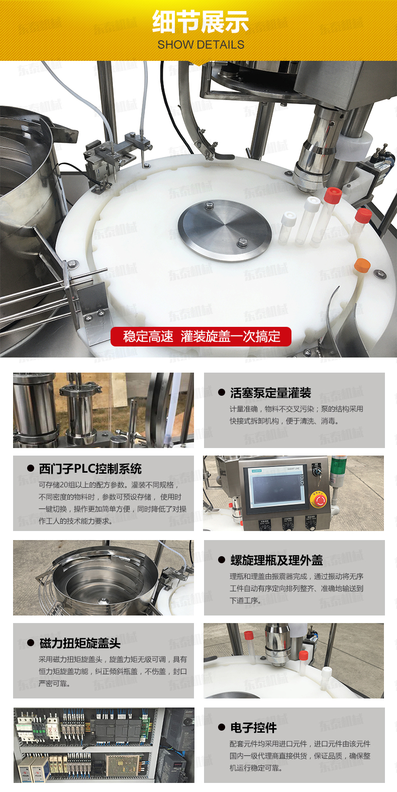 診斷試劑灌裝旋蓋一體機在性能上、質量上液體灌裝機具有高速、可靠性強、產量高等優點,為整個行業的發展來說帶來了巨大的發展商機,也為液體類商品帶來更廣闊的發展前景。液體灌裝機的操作簡便,運行穩定,能有效節省企業成本,即可單機使用,也可進行搭配理瓶機、液體灌裝機、旋蓋機、封口機、貼標機等等設備組成一條生產流水線作業,各單機能獨立完成其工作,有獨立的操作系統,各單機聯動、分離快捷,并且調整快速、簡單,使生產的每個工序保證協調。廣泛應用于食品、化妝品、醫藥、油脂、日化、洗滌劑、農藥、化工等行業的灌裝。
