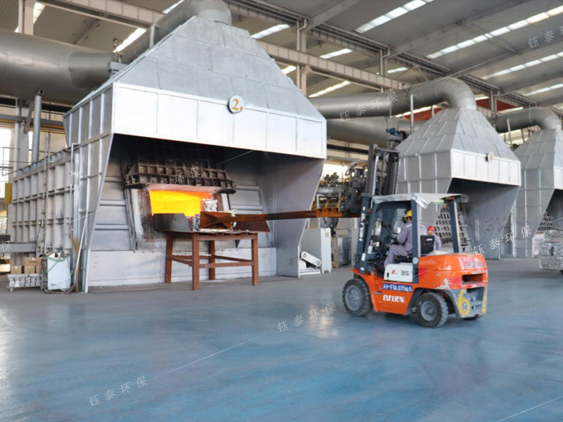 再生鋁雙室爐煙氣處理系統(tǒng)采用XLP高效旋風除塵器+強制排風冷卻器+脈沖布袋除塵器組成,雙室爐爐門排煙采用2個排煙罩,2個爐門罩交替打開;并配套爐膛排料輔助排煙系統(tǒng),1套雙室爐煙氣處理系統(tǒng)處理風量≥130000m3/h。除塵器運行后將雙室爐燃燒過程產(chǎn)生的高溫煙氣(溫度<250℃)和爐門罩排出的煙氣全部收集干凈,保證了工人的操作環(huán)境,達到了規(guī)定的排放標準,給生產(chǎn)企業(yè)帶來了巨大的經(jīng)濟效益。除塵器收集的顆粒污染物主要是熔煉過程中產(chǎn)生的金屬氧化物和非金屬氧化物,還有大量碳粒灰份等,除塵脫硫后:煙塵濃度:≤10mg/m3。